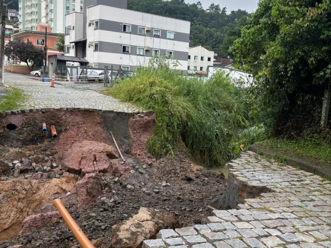 A força da água abriu crateras na Rua Fides Deeke, no bairro Itoupava Seca, e na Rua 2 de Setembro, no bairro Itoupava Norte. O Samae atua nos reparos e o abastecimento de água pode apresentar intermitências até o fim do dia.