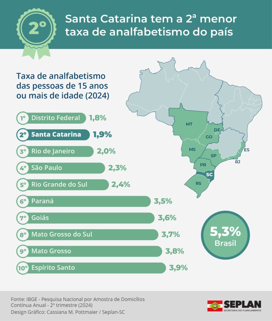 Em 2022, Santa Catarina tinha a terceira menor taxa de analfabetismo no recorte pesquisado, empatando com o estado de São Paulo, ambos com taxa de 2,2%. Naquele ano, o Distrito Federal liderava, com 1,9%, seguido pelo Rio de Janeiro, com 2,1%. Já no levantamento referente ao mesmo trimestre de 2024, Santa Catarina avançou e conquistou a segunda posição no ranking.