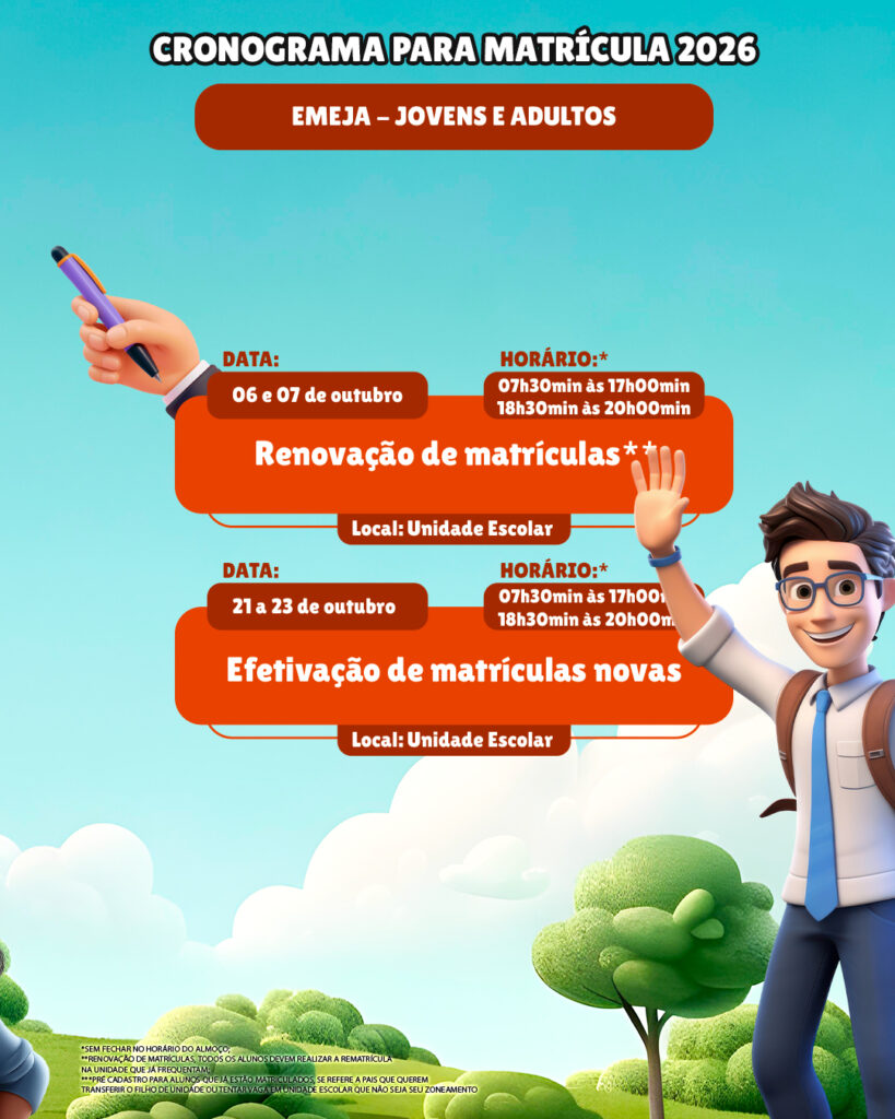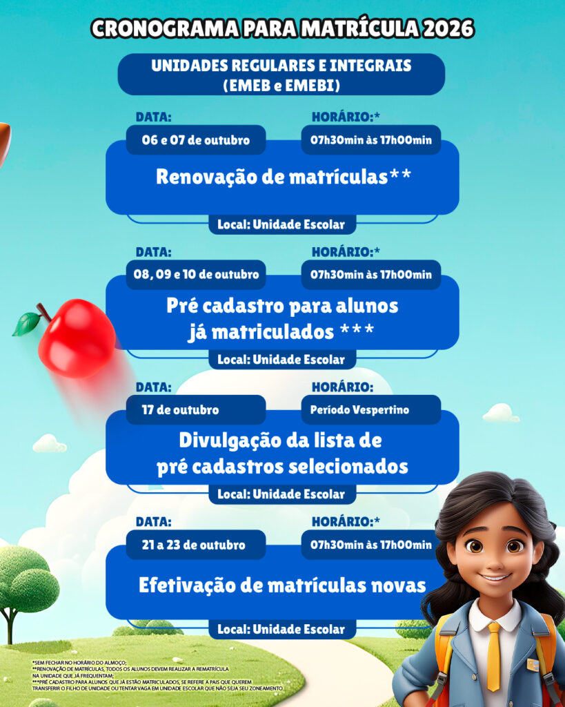 As matrículas e rematrículas devem ser realizadas diretamente nas unidades escolares, de acordo com as datas e horários previstos no cronograma oficial, lembrando que o atendimento ocorrerá sem fechar para o almoço, facilitando o acesso das famílias.