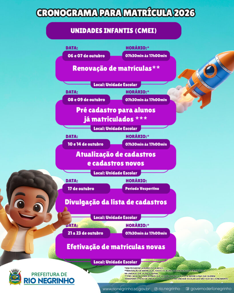 Secretaria Municipal de Educação de Rio Negrinho informa que já está aberto o cronograma de matrículas e rematrículas para o ano letivo de 2026 nas escolas e Centros Municipais de Educação Infantil (CMEIs) da rede municipal de ensino.