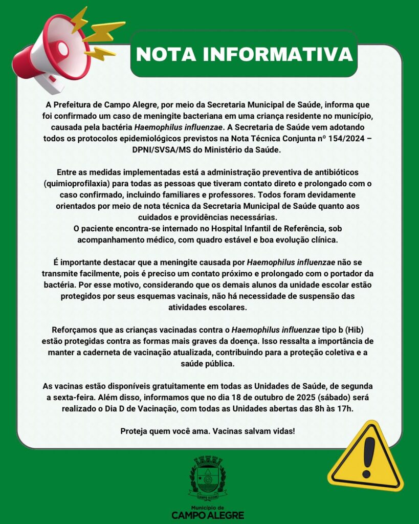 A Prefeitura de Campo Alegre emitiu na noite desta quarta-feira (8) uma nota oficial confirmando um caso de meningite bacteriana, causada pela bactéria Haemophilus influenzae, em uma criança residente na cidade.Segundo o comunicado, a Secretaria Municipal de Saúde vem adotando todos os protocolos epidemiológicos previstos na