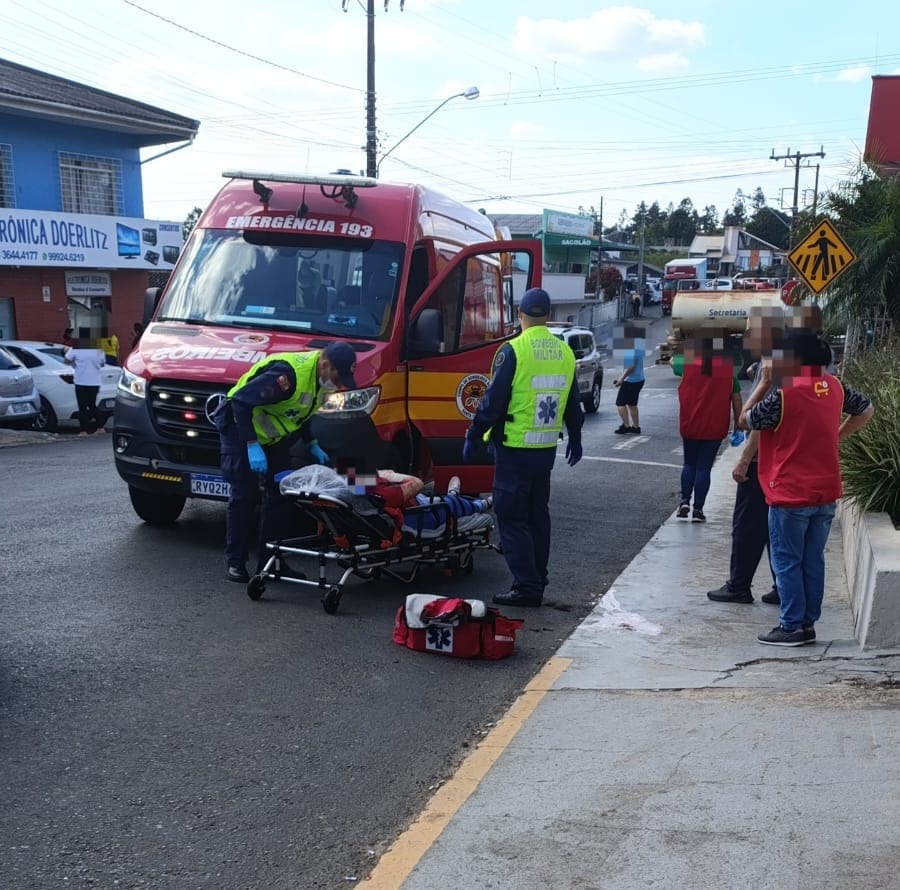 Um homem de 69 anos ficou ferido após uma colisão entre uma motocicleta e um caminhão na tarde desta quinta-feira (23), por volta das 16h17, na rua Luiz Scholtz, próximo ao Colégio Cenecista São José, no Centro de Rio Negrinho.