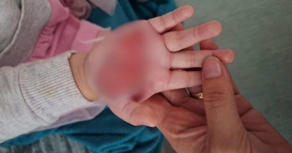 O ocorrido teria resultado em uma queimadura de grande extensão, causando o rompimento da pele de toda a palma da mão da vítima. Na manhã seguinte, a mulher teria informado o ocorrido ao pai da criança via WhatsApp.