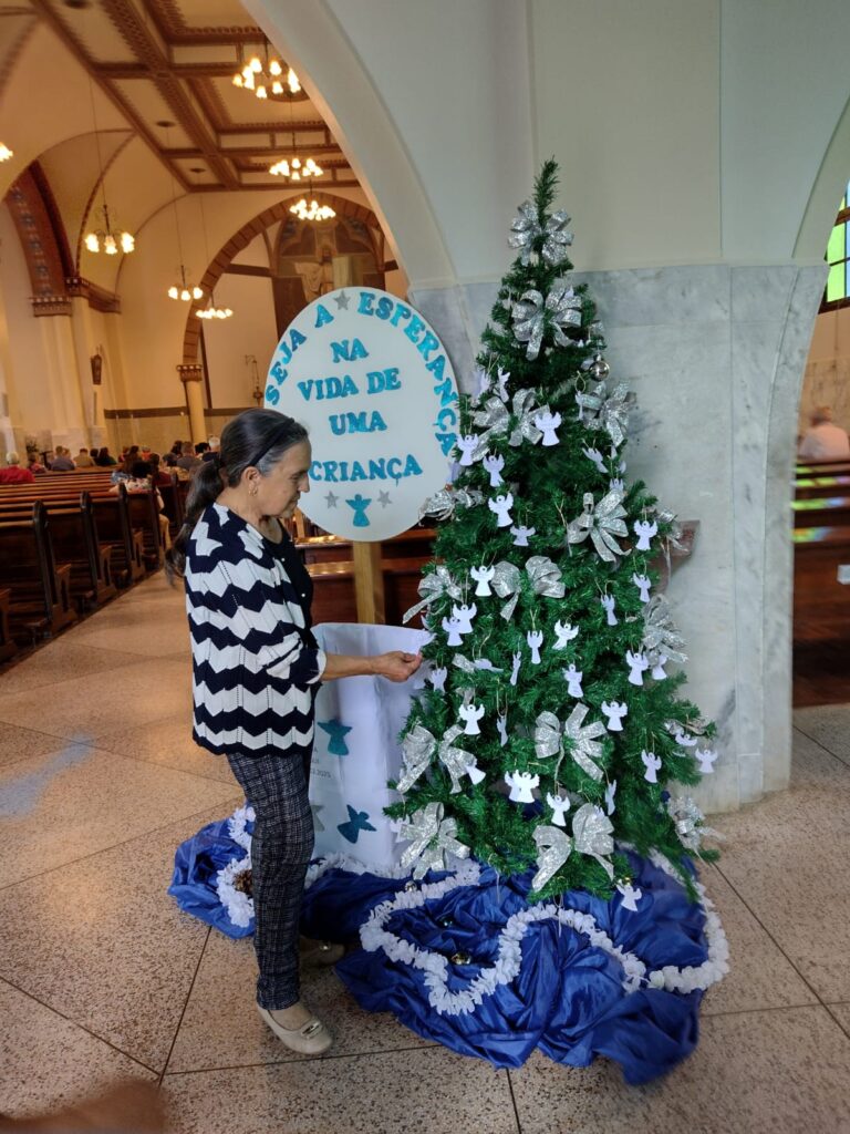 Além disso, uma linda árvore de Natal foi instalada na entrada da Igreja Matriz. Nela, diversos anjos decorativos estão pendurados, cada um trazendo escrito um item que pode ser doado para contribuir com a campanha — como fraldas, alimentos, doces e outros produtos essenciais.