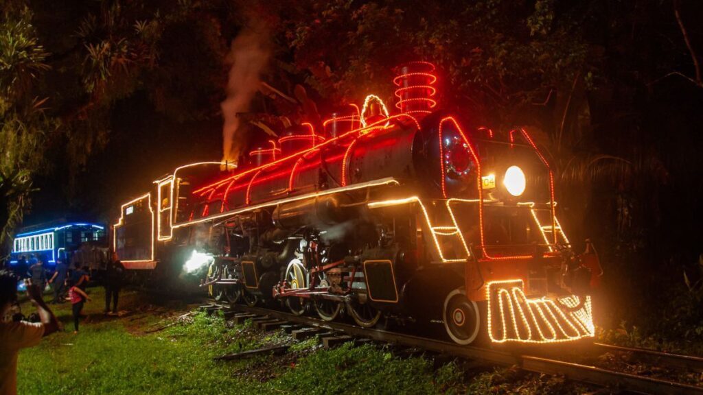 A tradição que emociona famílias de todo o Sul do Brasil está de volta. A Maria Fumaça Iluminada, modelo Mallet 204 — fabricada em 1950 e única em circulação na América do Sul — percorre novamente os trilhos catarinenses, agora decorada com mangueiras de LED que transformam a locomotiva em um verdadeiro espetáculo de luz.