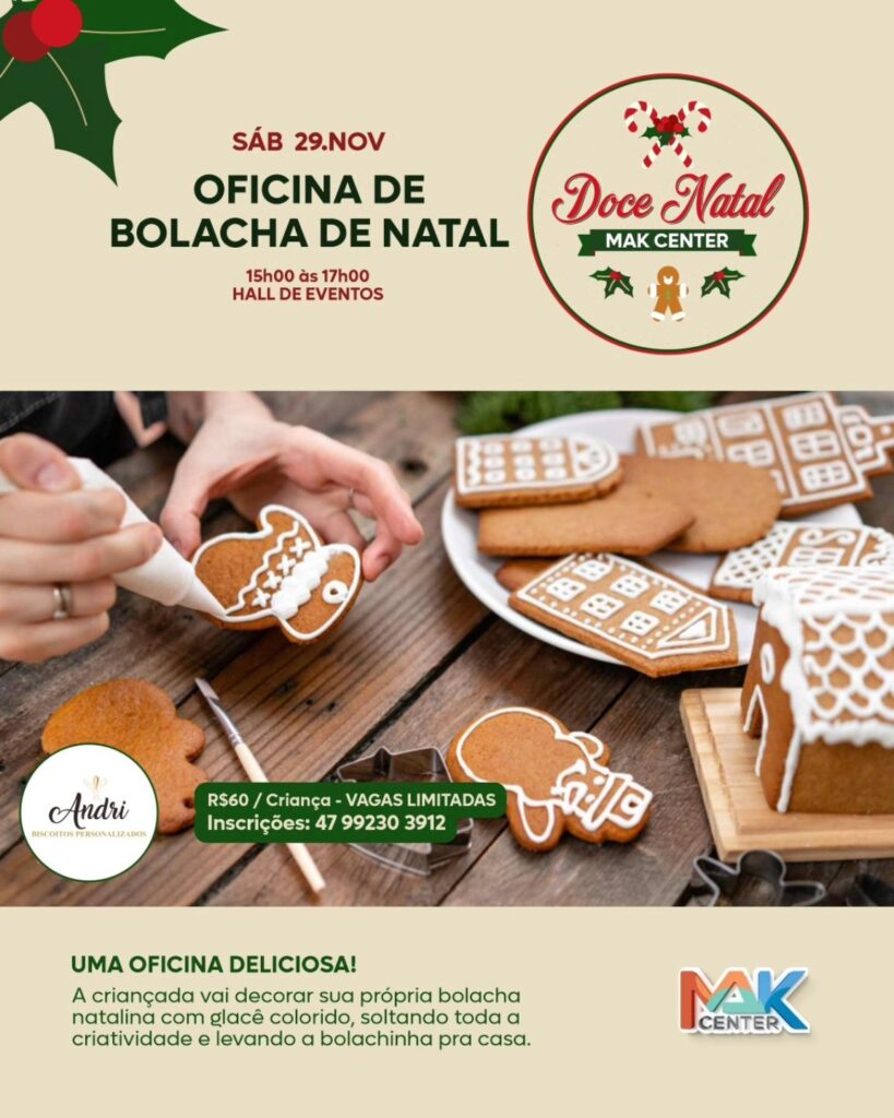 Durante a oficina, os pequenos terão a oportunidade de decorar suas próprias bolachinhas natalinas utilizando glacê colorido, transformando cada peça em uma verdadeira obra de arte comestível. A proposta é incentivar a imaginação, proporcionar diversão e criar memórias especiais em família.
