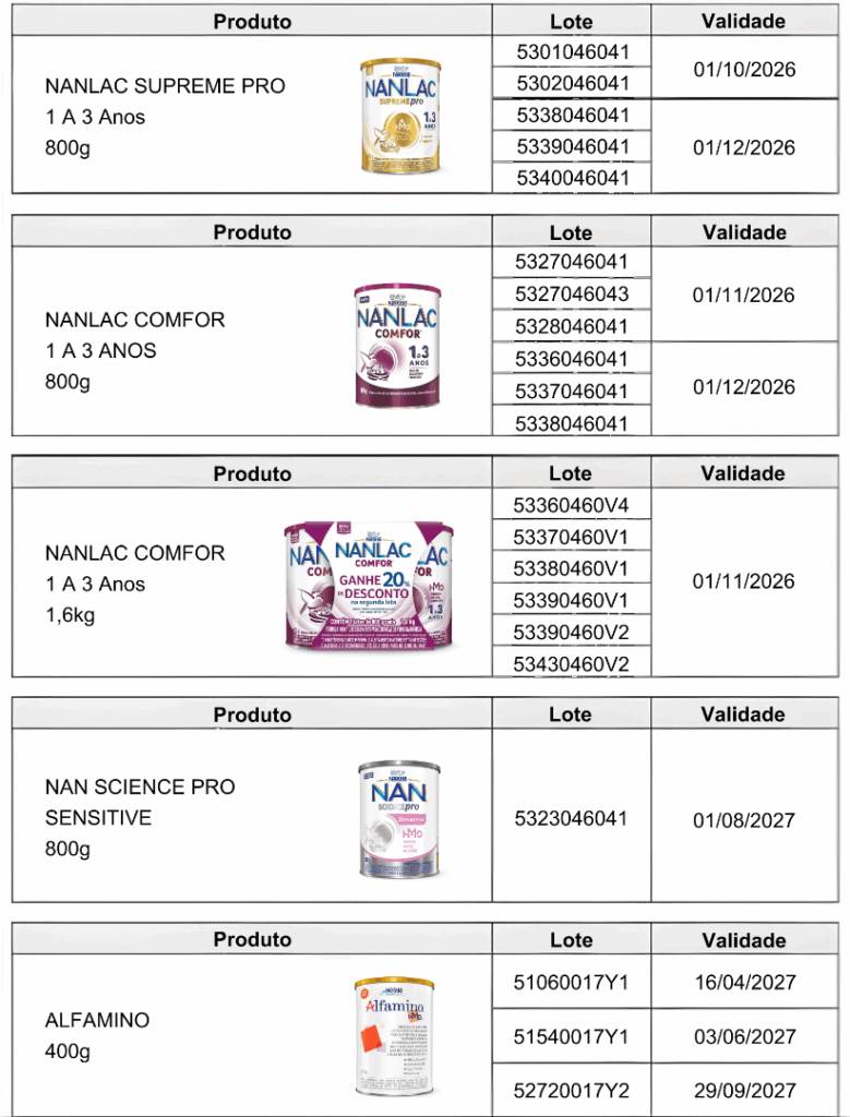 Se você utiliza produtos das marcas Nestogeno, Nan Supreme, Nanlac Supreme, Nanlac Comfor, Nan Sensitive e Alfamino, verifique o número do lote impresso no rótulo das fórmulas infantis. Se o produto pertencer a um dos lotes recolhidos, não deve ser utilizado ou oferecido para consumo. Os demais lotes desses produtos não foram afetados.
