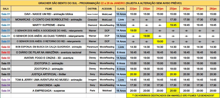 O Cine Gracher estreia quatro filmes a partir desta quinta-feira (22), sendo eles: TRILOGIA “O SENHOR DOS ANÉIS”, MARTY SUPREME, MONARCAS – O CONTO DAS BORBOLETAS e JUSTIÇA ARTIFICIAL.