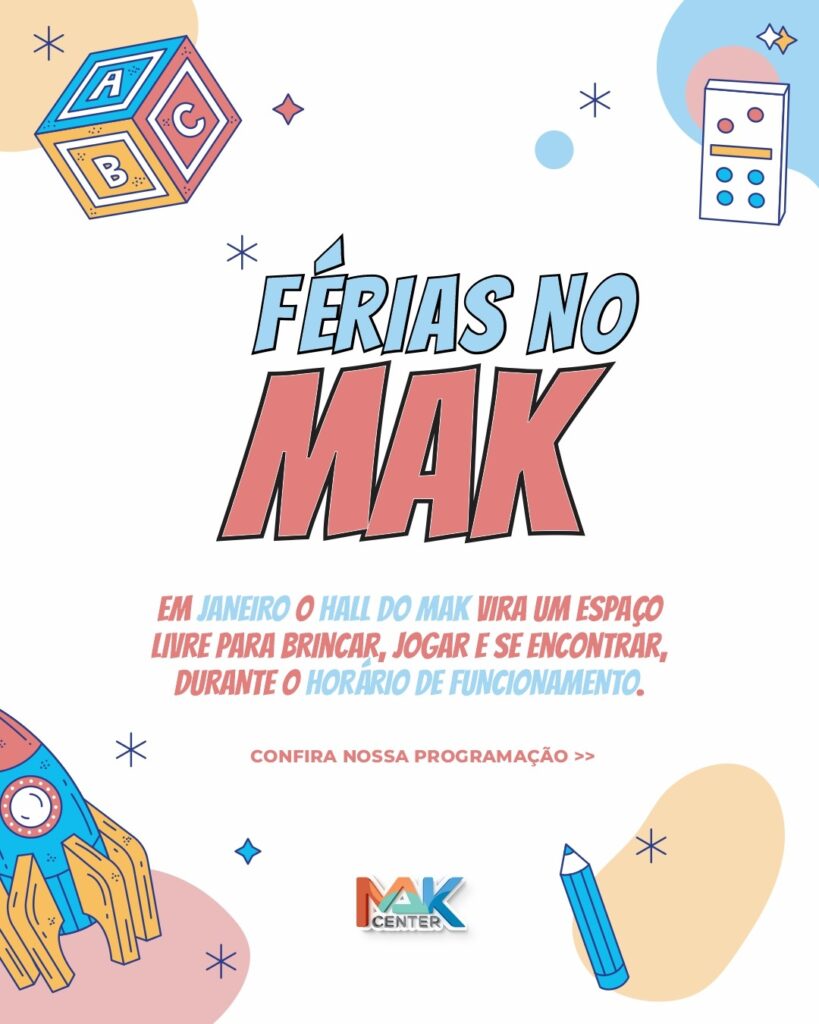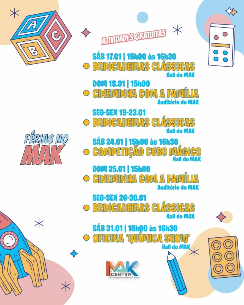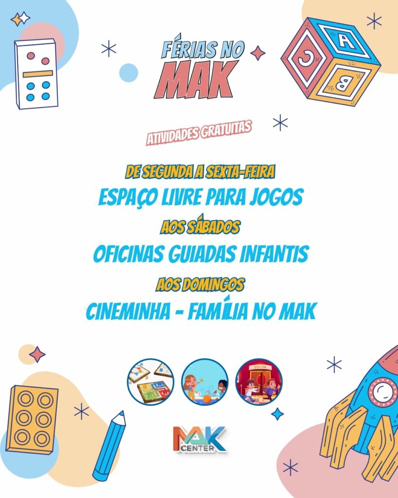 A programação Férias no MAK segue ao longo do mês com diversas ações gratuitas, incluindo brincadeiras clássicas, oficinas infantis e sessões de cineminha para toda a família.Serviço