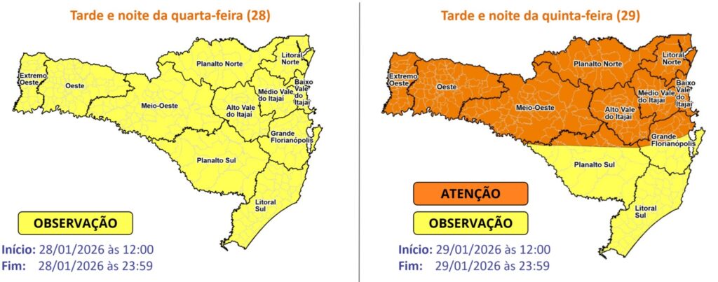 Na quinta-feira (29), os temporais se intensificam com chuva intensa, acompanhados por raios, rajadas de vento e eventual queda de granizo, com destaque para o Grande Oeste, Planalto Norte, Vale do Itajaí, Litoral Norte e Grande Florianópolis. Neste dia, o risco é ALTO para ocorrências associadas a alagamentos, enxurradas e destelhamentos. O risco é MODERADO para queda de galhos e árvores e danos na rede elétrica.