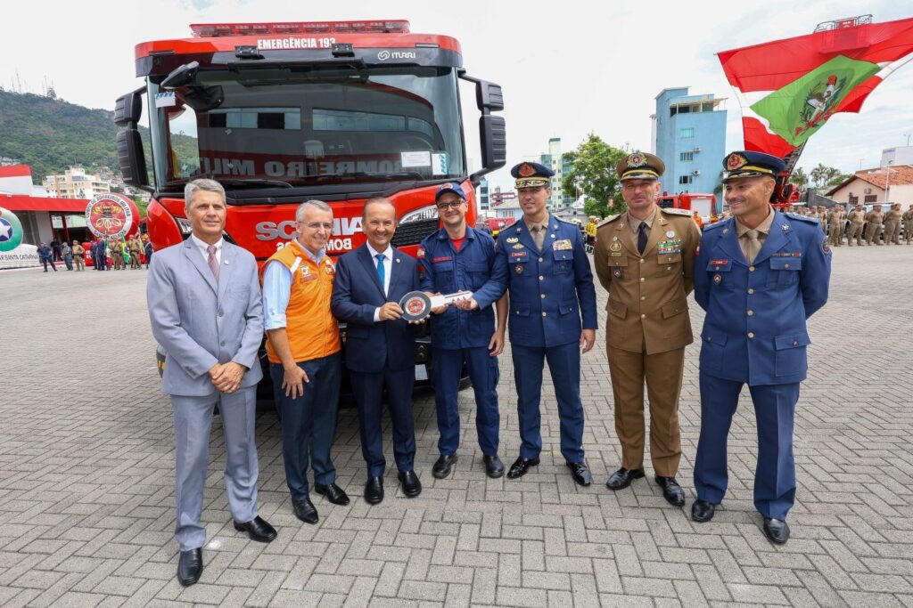 A solenidade também marcou a entrega imediata de um novo caminhão ABTR ao 3º Batalhão de Bombeiros Militar, em Blumenau. O veículo, adquirido por meio de convênio municipal, representa investimento de R$ 2,59 milhões. O modelo Scania P320XT possui certificação europeia de segurança, capacidade para cinco resgatistas, reservatório de 4 mil litros de água, bomba de mil galões por minuto, transmissão automática e guincho elétrico com tração de cinco toneladas.