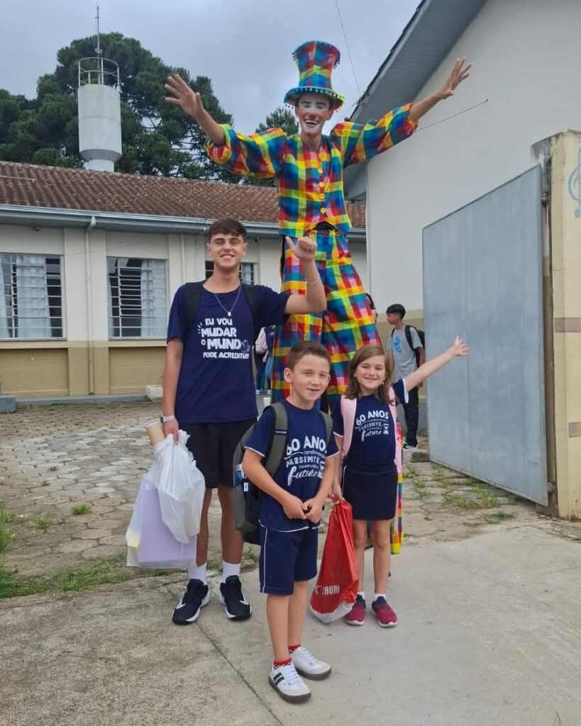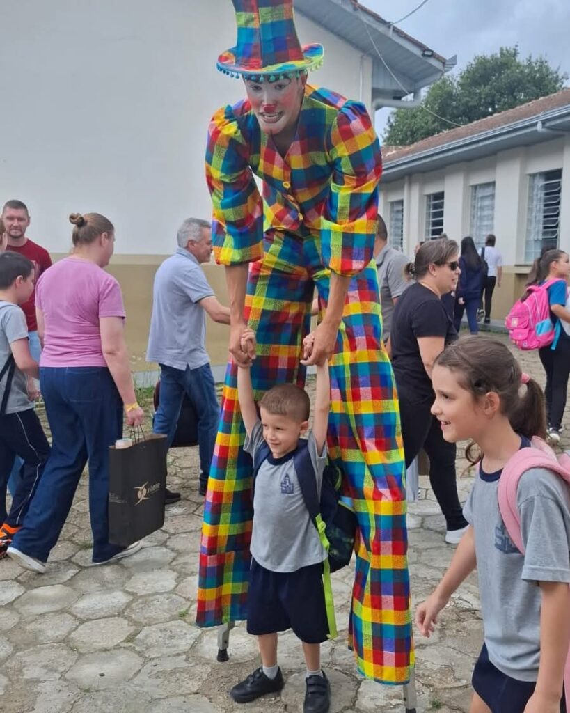 Logo na chegada, os estudantes foram recepcionados de maneira festiva pelo palhaço Quexinho, que, com sua animação, brincadeiras e bom humor, transformou a entrada na escola em um momento divertido e acolhedor, encantando crianças e familiares.Ao longo do dia, os alunos também participaram do espetáculo circense interativo “Atrapalhaço”, que garantiu momentos de descontração, risadas e muita interação.