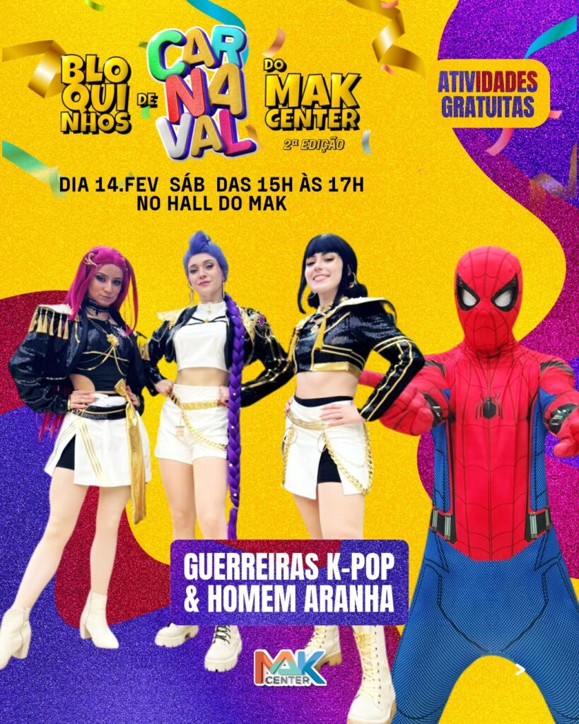 Entre as atrações, o público poderá conferir a presença das Guerreiras, apresentações de K-pop, além de um personagem que a criançada ama: o Homem-Aranha 🕷️🦸‍♂️.