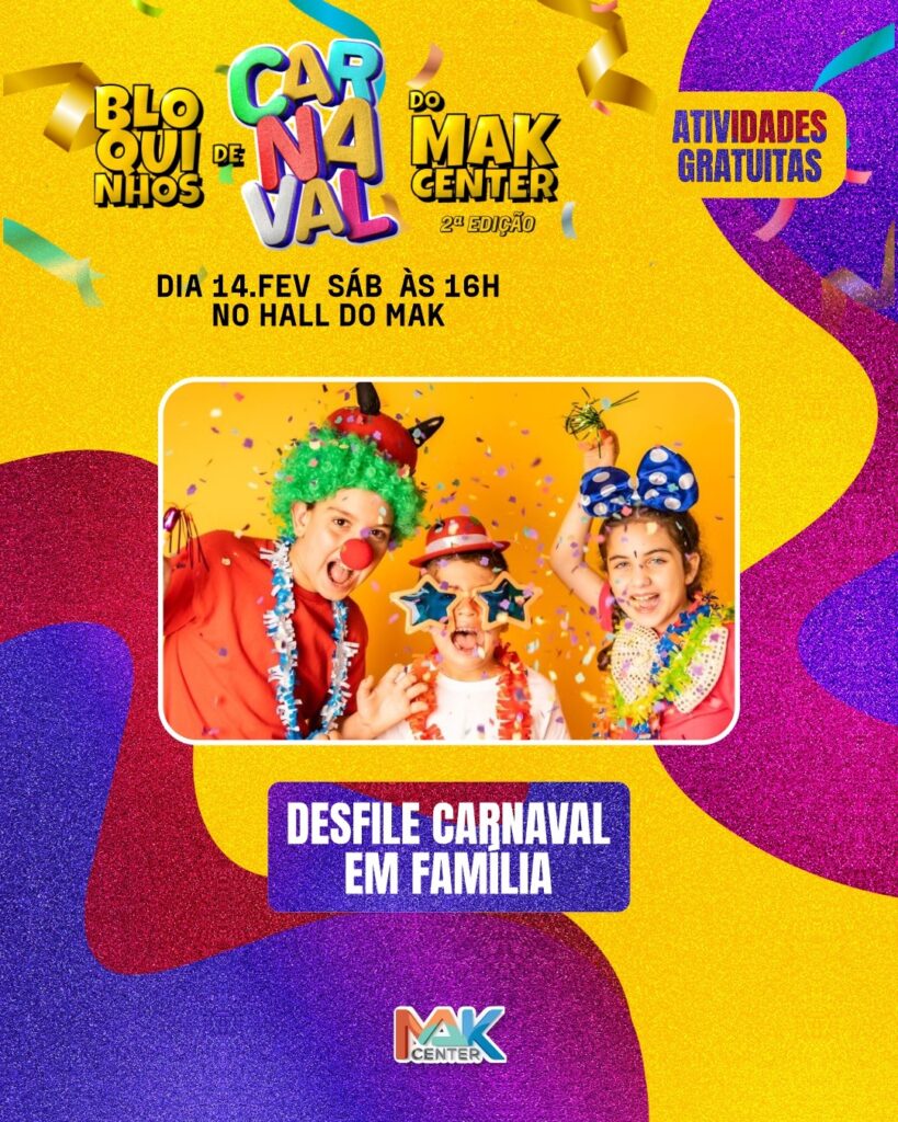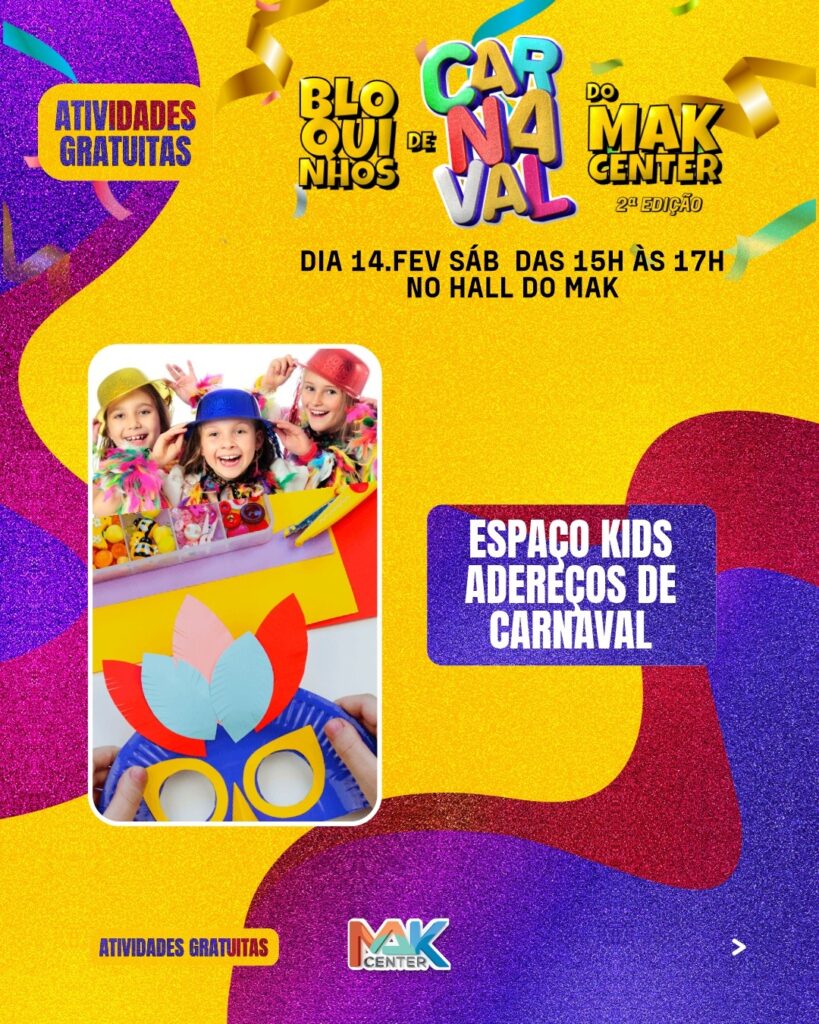 O clima de Carnaval vai tomar conta do MAK Center neste sábado, dia 14, com um Bloquinho de Carnaval cheio de alegria, cores e diversão para toda a família. O evento acontece das 15h às 17h, no hall de entrada do MAK Center, e a participação é totalmente gratuita.A programação foi pensada especialmente para crianças, jovens e adultos que querem curtir o Carnaval de forma leve e em família.