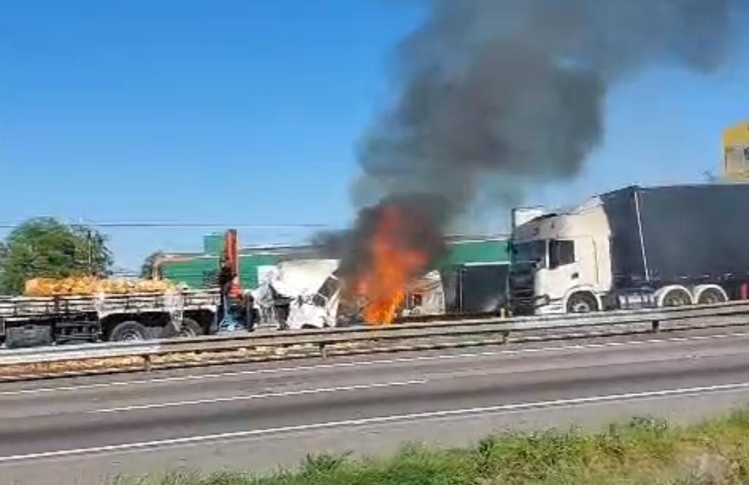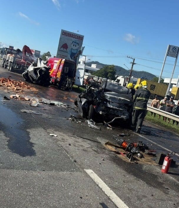 Os bombeiros militares foram acionados por volta das 8h30min e seguiram para o Km 115 da rodovia, em sentido Sul, ao Litoral. A Kombi pegou fogo e o incêndio foi combatido por populares. Um dos caminhões carregava tijolos, que ficaram espalhados pela BR.