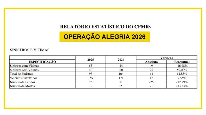 A Polícia Militar de Santa Catarina (PMSC), por meio do Comando de Polícia Militar Rodoviária (CPMRv), informou na tarde desta quarta-feira, 18, os números finais da Operação Alegria 2026. As ações, nas rodovias estaduais, iniciaram às 8h da última sexta-feira, 13, e seguiram até às 8h desta quarta-feira.