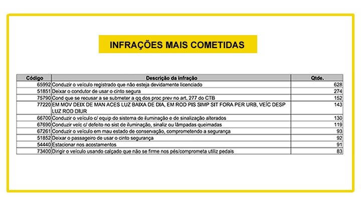 Entre as principais infrações de trânsito cometidas durante a operação, destaque para conduzir veículo que não esteja devidamente licenciado, com 628 condutores autuados, deixar o condutor de usar o cinto de segurança, com 274 autuações, e em terceiro lugar, 152 condutores acabaram autuados por recusa ao teste do etilômetro.