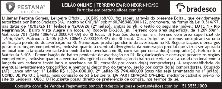 LEILÃO ONLINE – TERRENO EM RIO NEGRINHO​
