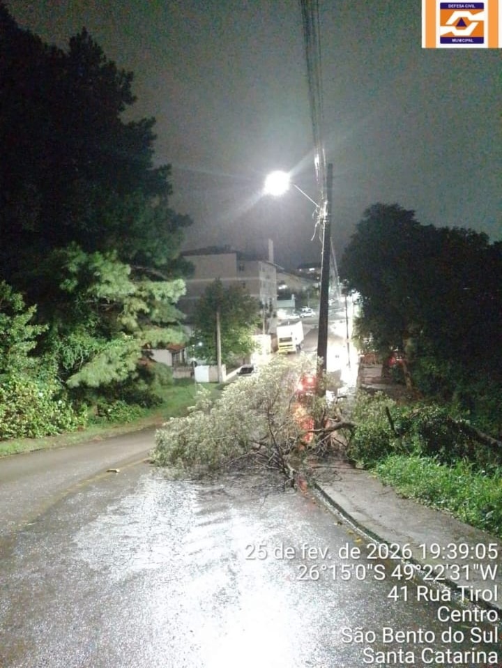 A forte chuva registrada na noite desta terça-feira (25) mobilizou a Defesa Civil de São Bento do Sul para o atendimento de diversas ocorrências relacionadas ao temporal no município.