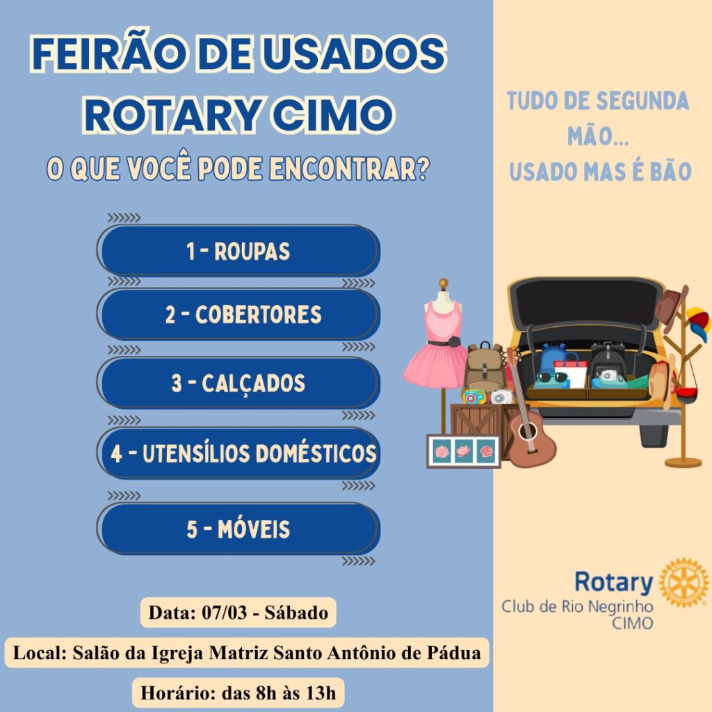 Quem está em busca de boas oportunidades para economizar e ainda ajudar uma causa social já pode se programar. O Feirão de Usados do Rotary Cimo será realizado neste sábado, 7 de março, em Rio Negrinho, reunindo diversos itens de segunda mão em bom estado e com preços acessíveis.Promovido pelo Rotary Club de Rio Negrinho Cimo, o evento acontecerá no Salão da Igreja Matriz Santo Antônio de Pádua, das 8h às 13h.Durante o feirão, a comunidade poderá encontrar uma grande variedade de produtos, entre eles: