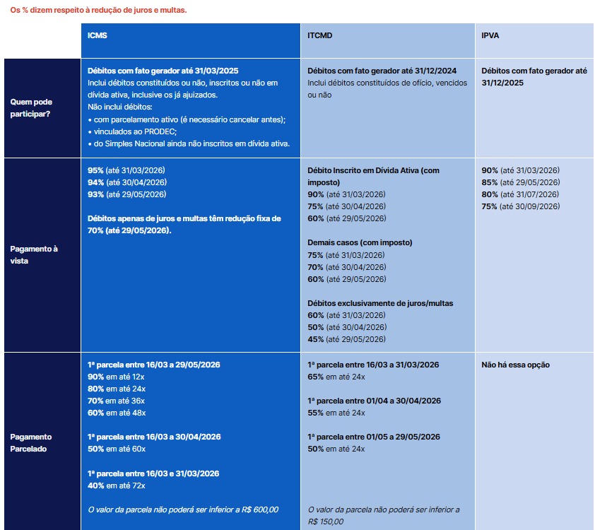 A negociação envolve débitos de ICMS gerados até 31 de março de 2025 (confira a tabela abaixo para verificar as opções para o IPVA e ITCMD). A expectativa do Governo do Estado é recuperar até R$ 1 bilhão somente com débitos de ICMS.
