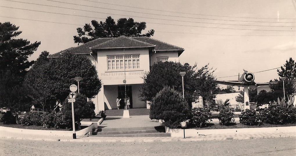 Imagem do então prédio da Prefeitura Municipal, situada na Praça Oldegar Olsen Sapucaia. Este prédio construído em 1935, serviu como sede do Distrito de Rio Negrinho até 1954