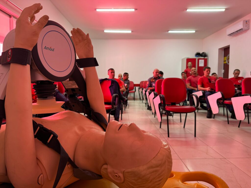 Durante as instruções, os participantes recebem treinamento específico para o manuseio do compressor torácico automático, equipamento utilizado para auxiliar na realização da reanimação cardiopulmonar (RCP), garantindo compressões contínuas e de alta qualidade em atendimentos prolongados ou de maior complexidade.