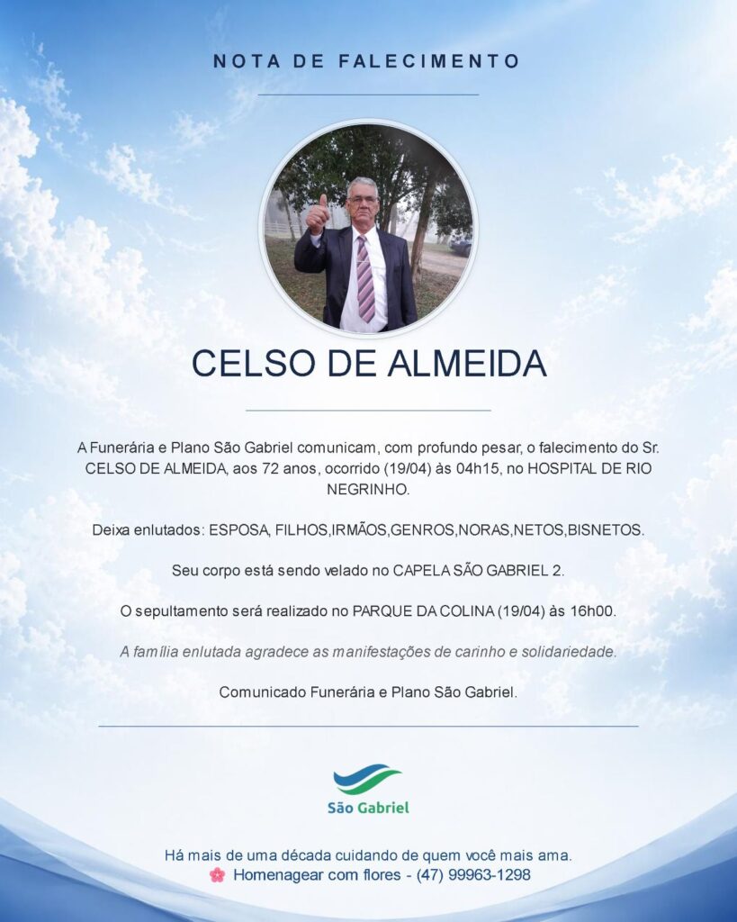 A Funerária e Plano São Gabriel comunicam, com profundo pesar, o falecimento do Sr. Celso de Almeida, aos 72 anos, ocorrido hoje, às 04h15, no Hospital de Rio Negrinho.