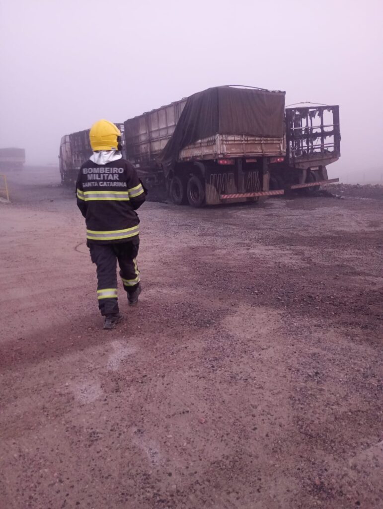 Na madrugada desta segunda-feira (20), por volta das 4h16, um incêndio veicular mobilizou equipes do Corpo de Bombeiros Militar de Rio Negrinho na rodovia SC-112, no bairro Volta Grande.As guarnições das viaturas ABTR-123, ABTR-05 e ASU-512 foram acionadas para atender a ocorrência em um pátio de uma empresa de depósito de grãos. Ao chegarem ao local, os bombeiros confirmaram que o incêndio já estava em fase de desenvolvimento completo em uma carreta DAF/XF105, acoplada a um semirreboque, e em fase de crescimento em outra carreta, modelo Volvo/FH380, que estava estacionada ao lado.