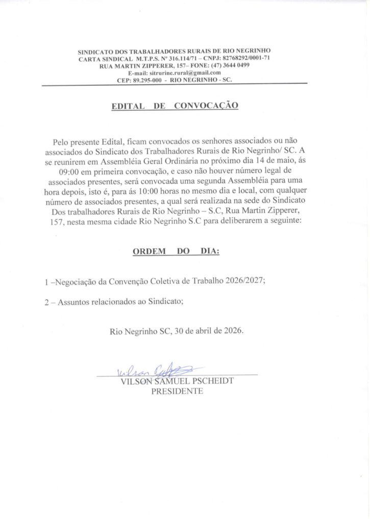 EDITAL CONVOCAÇÃO DO SINDICATO DOS TRABALHADORES RURAIS DE RIO NEGRINHO