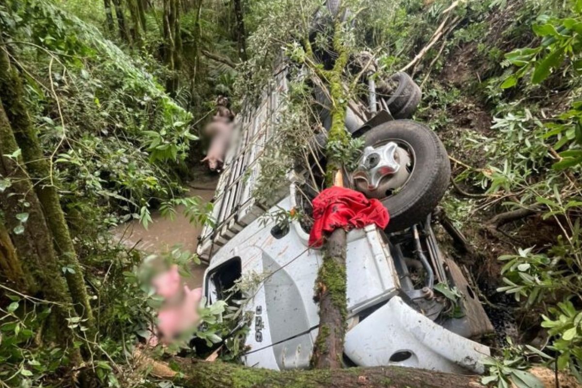 Caminhão com suínos sai da pista e cai em barranco na BR-280 em Três Barras; motorista fica ferido