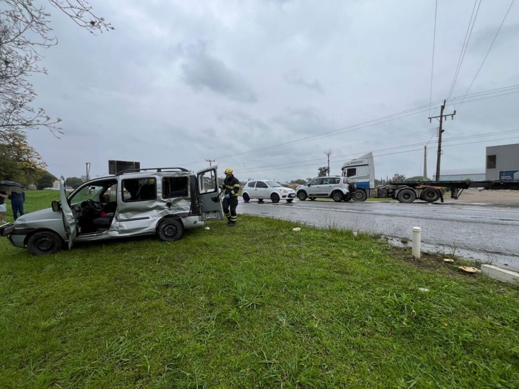 Mulher de 69 anos fica presa em veículo após colisão lateral com caminhão na BR-280 em Mafra