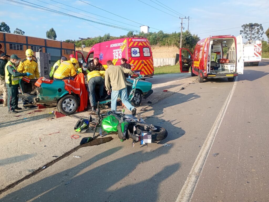 Colisão entre moto e carro deixa três feridos na BR-280, em Rio Negrinho